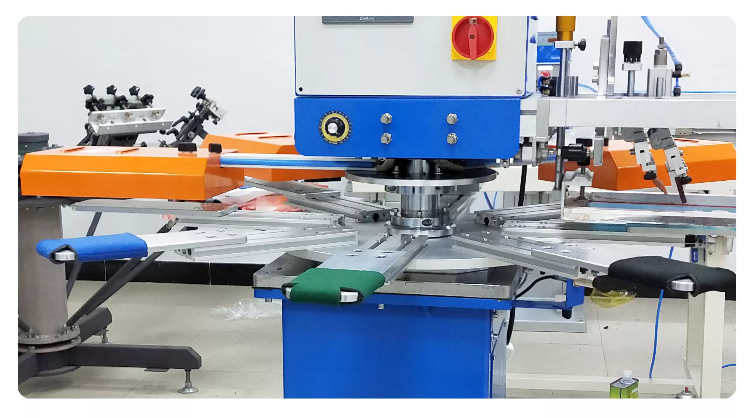 5. ロータリーワークテーブルには 8 つのステーションがあり、1 つはロード用、1 つは印刷用、2 つは乾燥用、1 つはアンロード用で、5 つのステーションが同時に作業できるようになります。