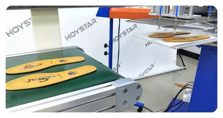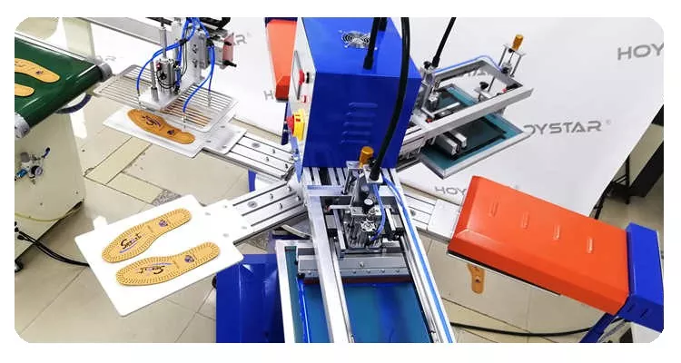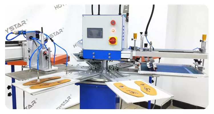 6 個のワークステーションと 2 個の乾燥システムを備えた靴インソール用自動 2 色スクリーン印刷機