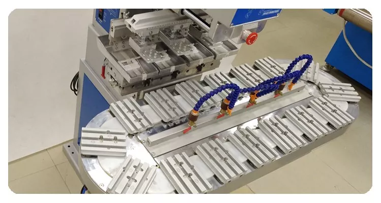 SCM (シングルチップマイクロコンピュータ) IC を搭載したコンベア付きビッグサイズ 4 色パッドプリンタは、動作シーケンスをプログラムします。半自動モードと自動モードの両方を使用すると、オペレーターはさまざまな生産ニーズに適応できます。